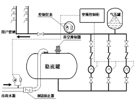 1. 當(dāng)市政管網(wǎng)本身滿足供水需求時(shí);設(shè)備處于停機(jī)狀態(tài),市政水源通過(guò)旁通管路或流經(jīng)水泵直接向用戶(hù)管網(wǎng)供水。